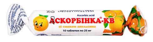 діюча речовина: кислота аскорбінова; таблетки зі смаком апельсина 1 таблетка містить кислоти аскорбінової (вітаміну С) 25 мг; допоміжні речовини: цукор, кислота стеаринова, крохмаль картопляний, глюкози моногідрат, кислота лимонна безводна, ароматизатор харчовий порошкоподібний «апельсин»;таблетки зі смаком м’яти1 таблетка містить кислоти аскорбінової (вітаміну С) 25 мг; допоміжні речовини: цукор, кислота стеаринова, крохмаль картопляний, глюкози моногідрат, ароматизатор харчовий порошкоподібний «м’ята»;таблетки зі смаком полуниці 1 таблетка містить кислоти аскорбінової (вітаміну С) 25 мг; допоміжні речовини: цукор, кислота стеаринова, крохмаль картопляний, глюкози моногідрат, кислота лимонна безводна, ароматизатор харчовий порошкоподібний «полуниця»;таблетки зі смаком лимона 1 таблетка містить кислоти аскорбінової (вітаміну С) 25 мг; допоміжні речовини: цукор, кислота стеаринова, крохмаль картопляний, глюкози моногідрат, кислота лимонна безводна, ароматизатор харчовий порошкоподібний «лимон»;таблетки зі смаком тутті-фрутті1 таблетка містить кислоти аскорбінової (вітаміну С) 25 мг; допоміжні речовини: цукор, кислота стеаринова, крохмаль картопляний, глюкози моногідрат, кислота лимонна безводна, ароматизатор харчовий порошкоподібний «тутті-фрутті»;таблетки зі смаком дині1 таблетка містить кислоти аскорбінової (вітаміну С) 25 мг; допоміжні речовини: цукор, кислота стеаринова, крохмаль картопляний, глюкози моногідрат, кислота лимонна безводна, ароматизатор харчовий порошкоподібний «диня»;таблетки зі смаком манго1 таблетка містить кислоти аскорбінової (вітаміну С) 25 мг; допоміжні речовини: цукор, кислота стеаринова, крохмаль картопляний, глюкози моногідрат, кислота лимонна безводна, ароматизатор харчовий порошкоподібний «манго»;таблетки зі смаком банана1 таблетка містить кислоти аскорбінової (вітаміну С) 25 мг; допоміжні речовини: цукор, кислота стеаринова, крохмаль картопляний, глюкози моногідрат, кислота лимонна безводна, ароматизатор харчовий порошкоподібний «банан».