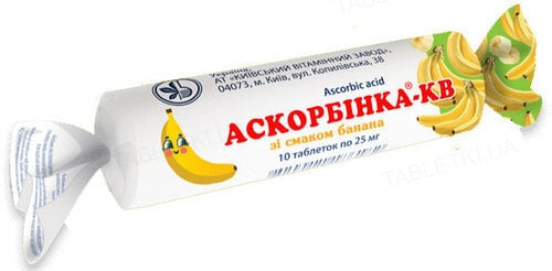 діюча речовина: кислота аскорбінова; таблетки зі смаком апельсина 1 таблетка містить кислоти аскорбінової (вітаміну С) 25 мг; допоміжні речовини: цукор, кислота стеаринова, крохмаль картопляний, глюкози моногідрат, кислота лимонна безводна, ароматизатор харчовий порошкоподібний «апельсин»;таблетки зі смаком м’яти1 таблетка містить кислоти аскорбінової (вітаміну С) 25 мг; допоміжні речовини: цукор, кислота стеаринова, крохмаль картопляний, глюкози моногідрат, ароматизатор харчовий порошкоподібний «м’ята»;таблетки зі смаком полуниці 1 таблетка містить кислоти аскорбінової (вітаміну С) 25 мг; допоміжні речовини: цукор, кислота стеаринова, крохмаль картопляний, глюкози моногідрат, кислота лимонна безводна, ароматизатор харчовий порошкоподібний «полуниця»;таблетки зі смаком лимона 1 таблетка містить кислоти аскорбінової (вітаміну С) 25 мг; допоміжні речовини: цукор, кислота стеаринова, крохмаль картопляний, глюкози моногідрат, кислота лимонна безводна, ароматизатор харчовий порошкоподібний «лимон»;таблетки зі смаком тутті-фрутті1 таблетка містить кислоти аскорбінової (вітаміну С) 25 мг; допоміжні речовини: цукор, кислота стеаринова, крохмаль картопляний, глюкози моногідрат, кислота лимонна безводна, ароматизатор харчовий порошкоподібний «тутті-фрутті»;таблетки зі смаком дині1 таблетка містить кислоти аскорбінової (вітаміну С) 25 мг; допоміжні речовини: цукор, кислота стеаринова, крохмаль картопляний, глюкози моногідрат, кислота лимонна безводна, ароматизатор харчовий порошкоподібний «диня»;таблетки зі смаком манго1 таблетка містить кислоти аскорбінової (вітаміну С) 25 мг; допоміжні речовини: цукор, кислота стеаринова, крохмаль картопляний, глюкози моногідрат, кислота лимонна безводна, ароматизатор харчовий порошкоподібний «манго»;таблетки зі смаком банана1 таблетка містить кислоти аскорбінової (вітаміну С) 25 мг; допоміжні речовини: цукор, кислота стеаринова, крохмаль картопляний, глюкози моногідрат, кислота лимонна безводна, ароматизатор харчовий порошкоподібний «банан».