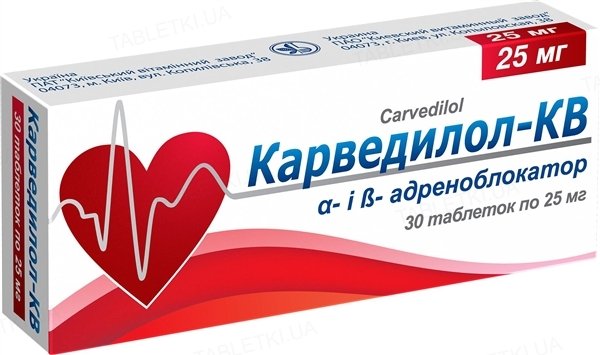 Фармакодинаміка.Карведилол є неселективним β-блокатором із судинорозширювальною дією. Він також має антиоксидантні та антипроліферативні властивості.Активний інгредієнт карведилол є рацематом; енантіомери розрізняються за своїми ефектами та метаболізмом. S(-) енантіомер має активність, спрямовану на блокування α1- і β-адренорецепторів, тоді як R(+) енантіомер проявляє лише активність, спрямовану на блокування α1-адренорецепторів. Завдяки кардіонеселективній блокаді β-адренорецепторів він знижує артеріальний тиск, частоту серцевих скорочень і серцевий викид. Карведилол знижує тиск у легеневій артерії та тиск у правому передсерді. Шляхом блокади α1-адренорецепторів він спричиняє периферичну вазодилатацію та знижує системний судинний опір. Завдяки цим ефектам зменшується навантаження на серцевий м’яз і попереджається розвиток стенокардії. У пацієнтів із серцевою недостатністю це призводить до збільшення фракції викиду з лівого шлуночка та зменшення симптомів хвороби. Схожі ефекти відзначалися у пацієнтів з дисфункцією лівого шлуночка. Карведилол не проявляє внутрішньої симпатоміметичної активності, і він, як і пропранолол, має мембраностабілізую-чі властивості. Активність реніну у плазмі крові зменшується, а затримка рідини в організмі відбувається рідко. Вплив на артеріальний тиск і частоту серцевих скорочень є найвираженішим через 1-2 години після введення.У хворих з артеріальною гіпертензією на тлі здорових нирок карведилол зменшує нирковий судинний опір. При цьому не виникає істотних змін клубочкової фільтрації, ниркового кровотоку та екскреції електролітів. Завдяки підтримці периферичного кровотоку рідко відбувається охолодження кінцівок, характерне для лікування β-блокаторами.Карведилол, як правило, не впливає на рівень ліпопротеїнів у сироватці крові.Фармакокінетика.Карведилол після перорального введення швидко і майже повністю всмоктується. Він майже повністю зв’язується з білками плазми крові. Об’єм розподілу становить приблизно 2 л/кг. Концентрація у плазмі крові пропорційна до застосованої дози.Через значний метаболічний розпад першого шляху у печінці (головним чином за допомогою печінкових ферментів CYP2D6 і CYP2C9) біологічна доступність карведилолу становить приблизно лише 30 %. Утворюються три активних метаболіти, що проявляють β-блокуючу активність; один з них (4’-гідроксифенілова похідна сполука) має у 13 разів більшу β-блокуючу активність, ніж карведіол. Порівняно з карведилолом активні метаболіти чинять слабку вазодилататорну активність. Метаболізм є стерео селективним; тому рівень R(+) карведилолу у плазмі крові у 2-3 рази перевищує рівень S(-) карведилолу. Рівні активних метаболітів у плазмі крові приблизно у 10 разів нижчі за рівні карведилолу. Період напіввиведення дуже різниться: 5-9 годин для R(+) карведилолу та 7-11 годин для S(-) карведилолу.У пацієнтів літнього віку спостерігається збільшення рівня карведилолу приблизно на 50 %. У пацієнтів із цирозом печінки біодоступність карведилолу збільшується у 4 рази, а максимальна концентрація у плазмі крові у 5 разів перевищує відповідні величини у здорових людей. У пацієнтів із порушеною функцією печінки біодоступність збільшується до 80 % через зменшений метаболічний розпад першого шляху. Оскільки карведилол виділяється переважно з калом, у 