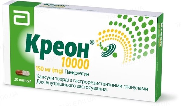 Фармакодинаміка. КРЕОН® містить панкреатин свинячого походження у формі вкритих кишковорозчинною оболонкою (стійкою до кислого середовища) гранул у желатинових капсулах. Капсули швидко розчиняються у шлунку, вивільняючи велику кількість гранул за мультидозовим принципом, що забезпечує добре перемішування із вмістом шлунка, транспорт зі шлунка разом з його вмістом та після вивільнення гарний розподіл ферментів у вмісті кишечнику. Коли гранули потрапляють до тонкого кишечнику, оболонка швидко розчиняється (при pH > 5,5), вивільняючи ферменти з ліполітичною, амілолітичною та протеолітичною активністю, що забезпечує розщеплення жирів, вуглеводів та білків. Продукти панкреатичного травлення після цього всмоктуються або одразу, або після подальшого гідролізу кишковими ферментами.Клінічна ефективність.Загалом було проведено 30 досліджень ефективності препарату КРЕОН® за участю пацієнтів з екзокринною недостатністю підшлункової залози (ЕНПЗ). Десять з них були плацебо-контрольованими. У цих дослідженнях брали участь пацієнти з муковісцидозом, хронічним панкреатитом або післяопераційними станами. В усіх рандомізованих, плацебо-контрольованих дослідженнях ефективності заздалегідь визначеною первинною метою було доведення більшої ефективності препарату КРЕОН® порівняно з плацебо за первинним показником ефективності – коефіцієнтом всмоктування жиру (КВЖ).Коефіцієнт всмоктування жиру визначає відсотковий вміст жиру, який всмоктався в організм, з урахуванням споживання жиру та виведення жиру з фекаліями. У плацебо-контрольованих дослідженнях за участю пацієнтів з ЕНПЗ середнє значення КВЖ (%) було вищим у пацієнтів, які приймали КРЕОН® (83,0 %), порівняно з групою плацебо (62,6 %). У ході всіх досліджень незалежно від їх дизайну середнє значення КВЖ (%) у кінці періоду лікування препаратом КРЕОН® було подібним до середніх значень КВЖ для препарату КРЕОН®, що застосовувався у ході плацебо-контрольованих досліджень.Лікування препаратом КРЕОН® значно зменшує симптоми, спричинені порушенням екзокринної функції підшлункової залози, включаючи консистенцію випорожнень, абдомінальний біль, метеоризм та частоту випорожнень, незалежно від первинного захворювання.Діти.Ефективність препарату КРЕОН® була продемонстрована у 288 дітей від новонародженого до підліткового віку, хворих на муковісцидоз. У ході всіх досліджень середні значення КВЖ на кінець періоду лікування препаратом КРЕОН® перевищували 80 % у дітей всіх вікових груп. Доклінічні дані з безпеки.Дані доклінічних досліджень не вказують на відповідну гостру, субхронічну або хронічну токсичність. Досліджень генотоксичності, канцерогенності або токсичного впливу на репродуктивність не проводилося.Фармакокінетика. Дослідження на тваринах не виявили ознак всмоктування ферментів у незміненому вигляді, і тому класичних фармакокінетичних досліджень не проводилося. Препарати ферментів підшлункової залози не потребують всмоктування для досягнення свого ефекту. Навпаки, їхня повна терапевтична дія проявляється у просвіті шлунково-кишкового тракту. Більше того, як білки вони піддаються протеолітичному травленню, проходячи через шлунково-кишковий тракт, перш ніж абсорбуватися у вигляді пептидів та амінокислот.