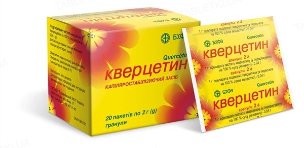 Фармакодинаміка. Флавоноїд кверцетин є агліконом багатьох рослинних флавоноїдних глікозидів, у тому числі рутину, і належить до вітамінних препаратів групи Р. Маючи капіляростабілізуючі властивості, пов’язані з антиоксидантним, мембраностабілізуючим впливом, лікарський засіб знижує проникність капілярів. Кверцетин має протизапальний ефект завдяки блокаді ліпооксигеназного шляху метаболізму арахідонової кислоти, зниженню синтезу лейкотрієнів, серотоніну та інших медіаторів запалення. Кверцетин чинить противиразкову дію (у разі застосування нестероїдних протизапальних засобів), а також має радіопротекторну активність (після рентген- та гамма-опромінень). Кардіопротекторні властивості кверцетину пов’язані з підвищенням енергетичного забезпечення кардіоміоцитів завдяки антиоксидантному впливу та поліпшенню кровообігу. Репаративні властивості кверцетину полягають у прискоренні загоєння ран. Препарат може впливати на процеси ремоделювання кісткової тканини, він проявляє стійку імуномодулюючу активність. Експериментально визначені також діуретичні, спазмолітичні, антисклеротичні властивості. Кверцетин здатний нормалізувати артеріальний тиск і стимулювати вивільнення інсуліну, пригнічувати синтез тромбоксану, уповільнювати агрегацію тромбоцитів. Кверцетин також зв’язується з рецепторами естрогенів. Завдяки естрогеноподібним властивостям (вплив на пролінгідроксилазу, пригнічення фактора некрозу пухлин та синтез інтерлейкінів) препарат має проостеокластні ефекти. Фармакокінетика. Не вивчалася.