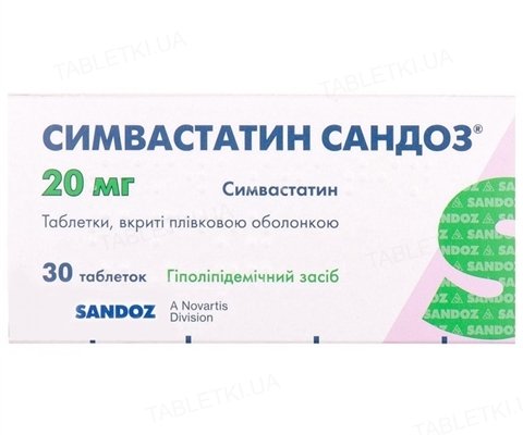 Фармакодинаміка. Механізм дії Симвастатин – гіпоглікемічна речовина, яку отримують з продукту ферментації Aspergillus lerreus. Після прийому внутрішньо симвастатин, що є неактивним лактоном, гідролізується в печінці і утворенням відповідного бета-гідроксикислотного похідного, що має високу інгібуючу активність щодо ГМГ-КоА-редуктази (З-гідрокси-З-метилглютарил-КоА-редуктази) – ферменту, що каталізує перетворення ГМГ-КоА в мевалонат, початкову та найбільш значущу стадію біосинтезз холестерину. Симвастатин знижує нормальні та підвищені рівні холестерин} ліпопроіеїнів ни зької щільності (ХС ЛПНЩ). ЛПНЩ утворюється з ліпопротеїну дуже низької щільності (ЛПДІІЩ) та катаболізується головним чином рецепторами з високою спорідненістю до ЛПНЩ. Механізм ЛПНЩ-знижувального ефекту симвастатину може складатись як зі зниження концентрації ХС ЛПДНЩ, так і зі стимуляції рецепторів ЛПНЩ. призводячи до зменшеного продукування іа збільшеного катаболізму холестерину ЛПНЩ. Рівні аполіпопротеїну В також значно падають під час лікування симвастатином. Крім того, симвастатин помітно збільшує ХС ЛПВЩ та знижує рівень тригліцеридів у плазмі. В результаті цих змін знижується співвідношення загального ХС до ХС ЛПВЩ та ХС ЛПНЩ до ХС ЛПВЩ. Фармакокінетика. Симвастатин є неактивним лактоном, що легко гідролізується. перетворюючись in vivo до бета- гідроксикислоти, потужного інгібітору ГМГ-КоА-редуктази. Гідроліз відбувається головним чином у печінці; швидкість гідролізу в плазмі людини дуже мала. Фармакокінегичні властивості оцінювались за участю дорослих. Фармакокінегичні дані щодо дітей та підлітків відсутні. Абсорбція. У людини симвастатин добре всмоктується та проходить екстенсивний первинний печінковий метаболізм. Виділення в печінку залежить від кровотоку в печінці. Печінка є первинним центром дії активної форми. Було виявлено, що доступність бета-гідроксикислоти до системного кровообігу після пероральної дози симвастатину становить менше 5 % дози Максимальна концентрація активних інгібіторів у плазмі досягається приблизно через 1-2 години після прийому симвастатину. Супутній прийом їжі не впливає на абсорбцію. Фармакокінетика однократної та багатократних доз симвастатину продемонструвала, що не відбувається ніякого накопичення лікарського препарату після багатократного готування. Розподіл. Зв’язування симвастатину та його активною метаболіту з білками плазми становить > 95 %. Виведення. Симвастатин є субстратом CYP3A4 (див. розділ «Протипоказання». «Взаємодія з іншими лікарськими засобами та інші види взаємодій»). Найбільшими метаболітами симвастатину, представленими в плазмі людини, є бета-гідроксикислота та чотири додаткові активні метаболіти. Після введення людині пероральної дози радіоактивної о симвастатину за 96 годин 60 % міченого препарату було виділено у випорожненнях і 13 % у сечі. Виявлена у випорожненнях кількість представляє еквівалентний абсорбований лікарський препарат, що виділяється з жовчю, а також неабсорбований лікарський препарат. Після внутрішньовенної ін’єкції метаболіту бета-гідроксикислоти його період напіввиведення становить у середньому 1,9 години. У формі інгібіторів з сечею виводиться в середньому тільки 0,3 дози. Симвастатинова кислота активно захоплюється гепатоцитами за допомогою переносника О